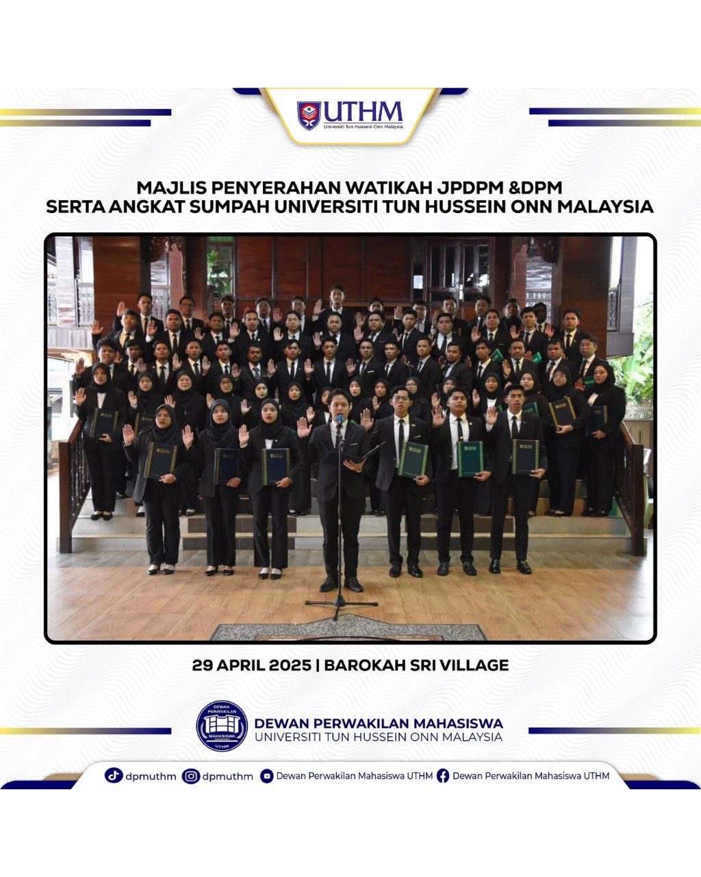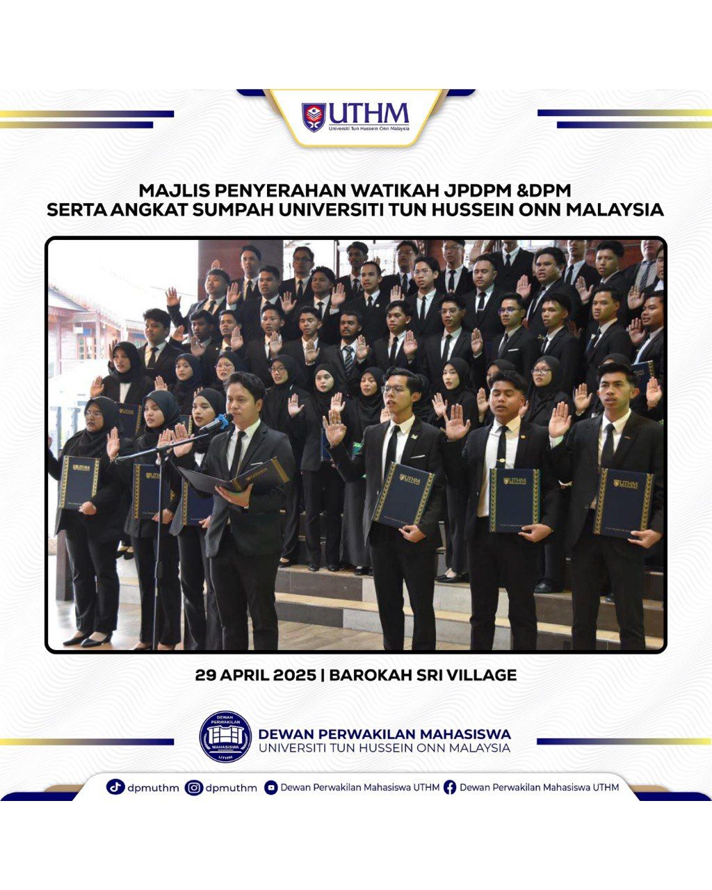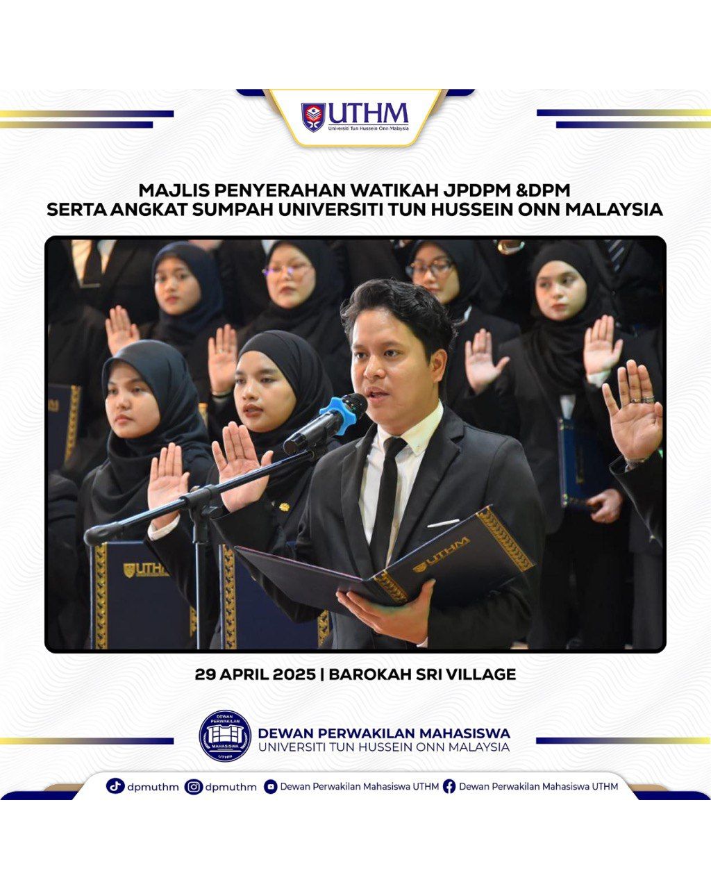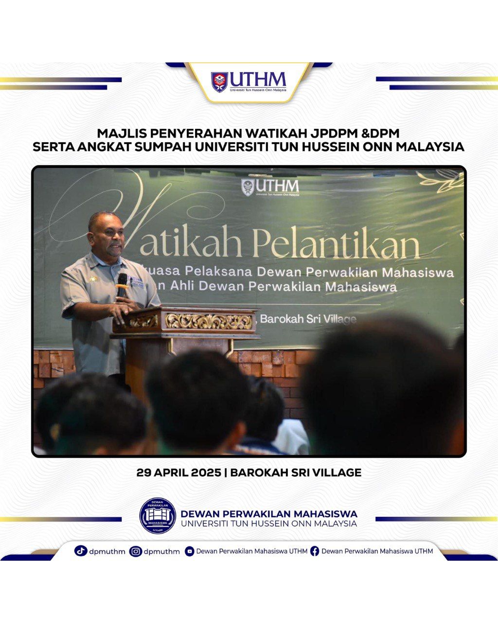 Alhamdulillah, telah sempurnanya majlis penyerahan watikah dan angkat sumpah kepada Jawatankuasa Pelaksana Dewan Perwakilan Mahasiswa dan Ahli Dewan Perwakilan Mahasiswa bagi edisi ke-6 pada 29 April 2025 di Barokah Sri Village yang dianjurkan oleh pihak Pejabat Hal Ehwal Pelajar UTHM.