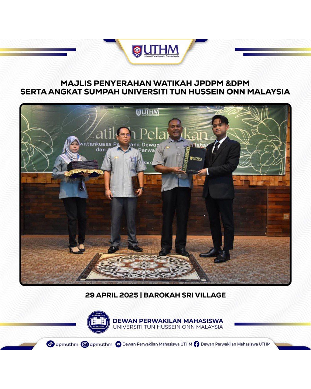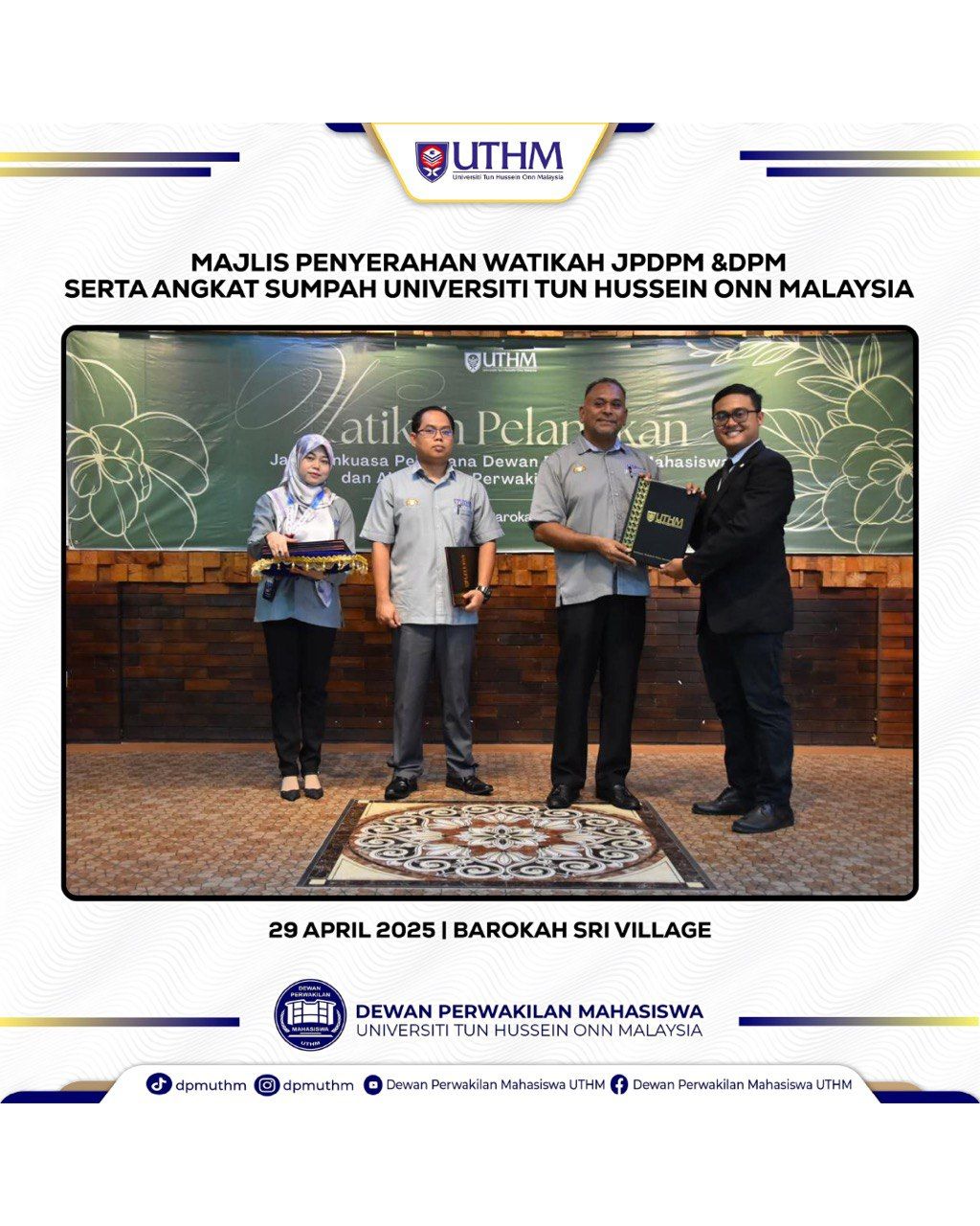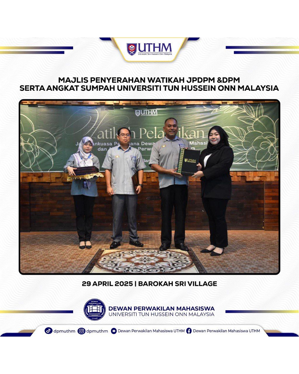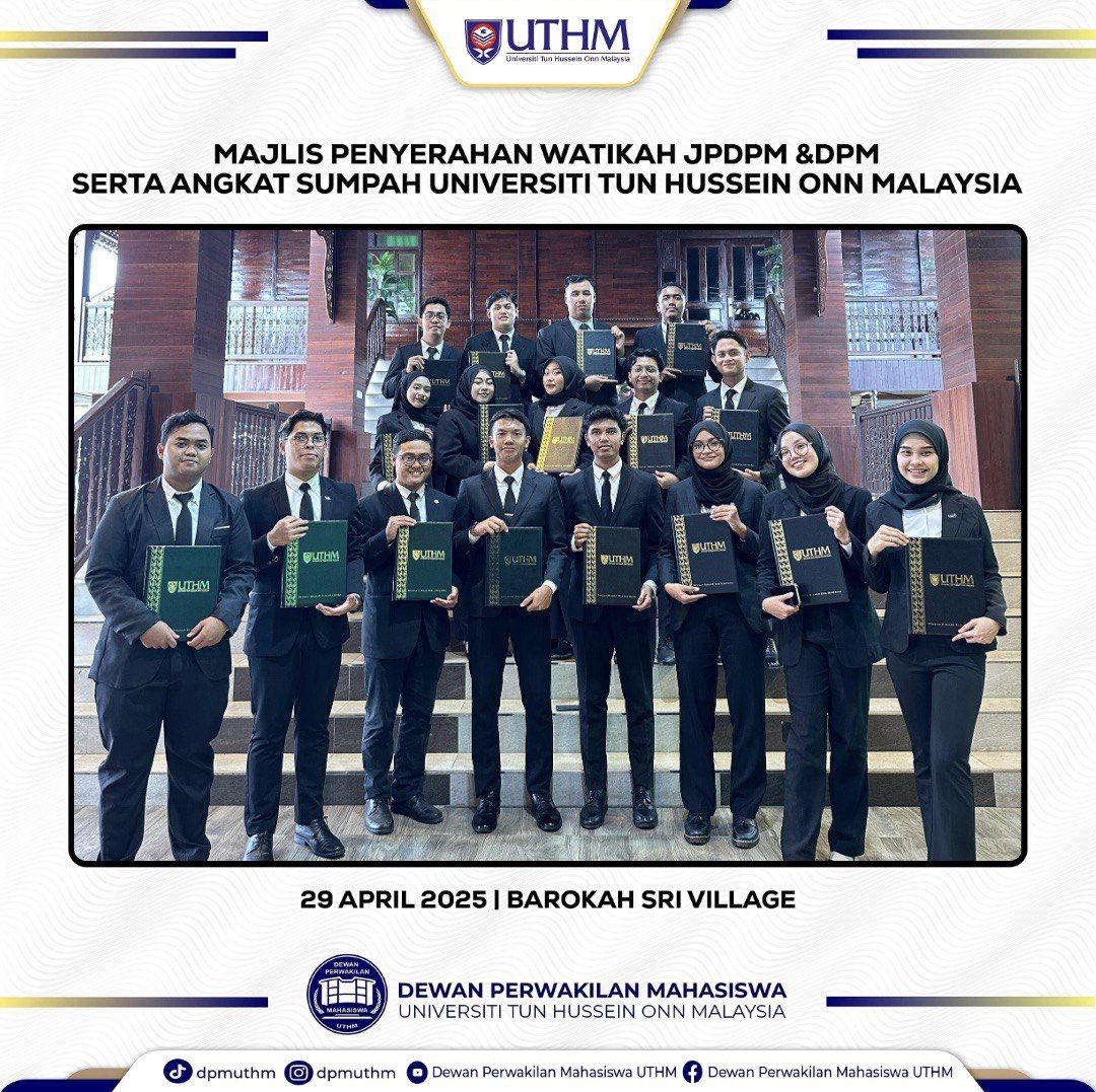 Alhamdulillah, telah sempurnanya majlis penyerahan watikah dan angkat sumpah kepada Jawatankuasa Pelaksana Dewan Perwakilan Mahasiswa dan Ahli Dewan Perwakilan Mahasiswa bagi edisi ke-6 pada 29 April 2025 di Barokah Sri Village yang dianjurkan oleh pihak Pejabat Hal Ehwal Pelajar UTHM.