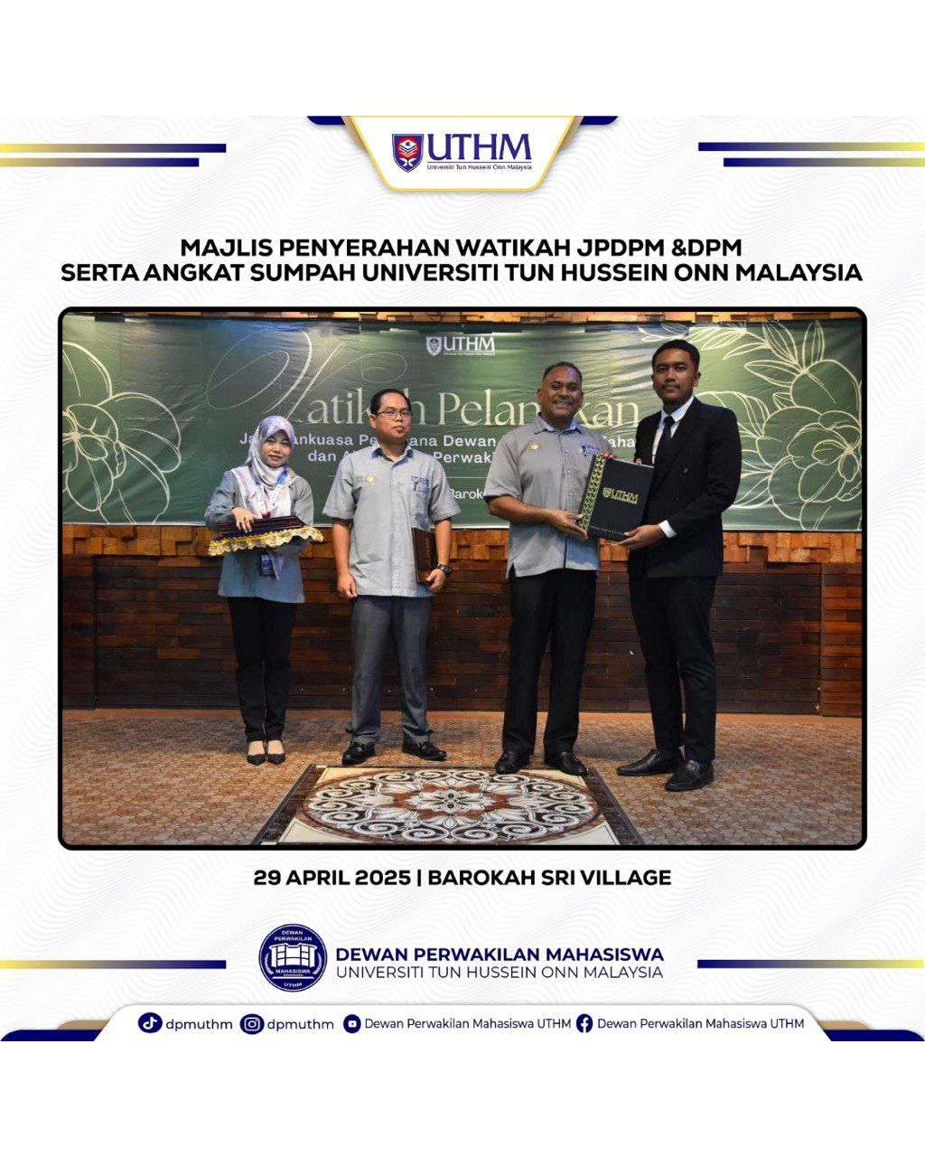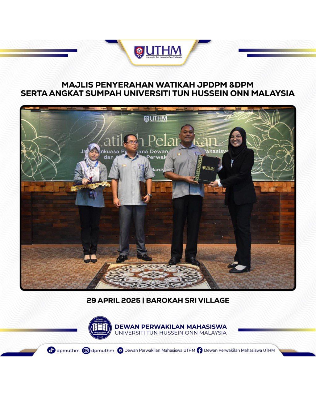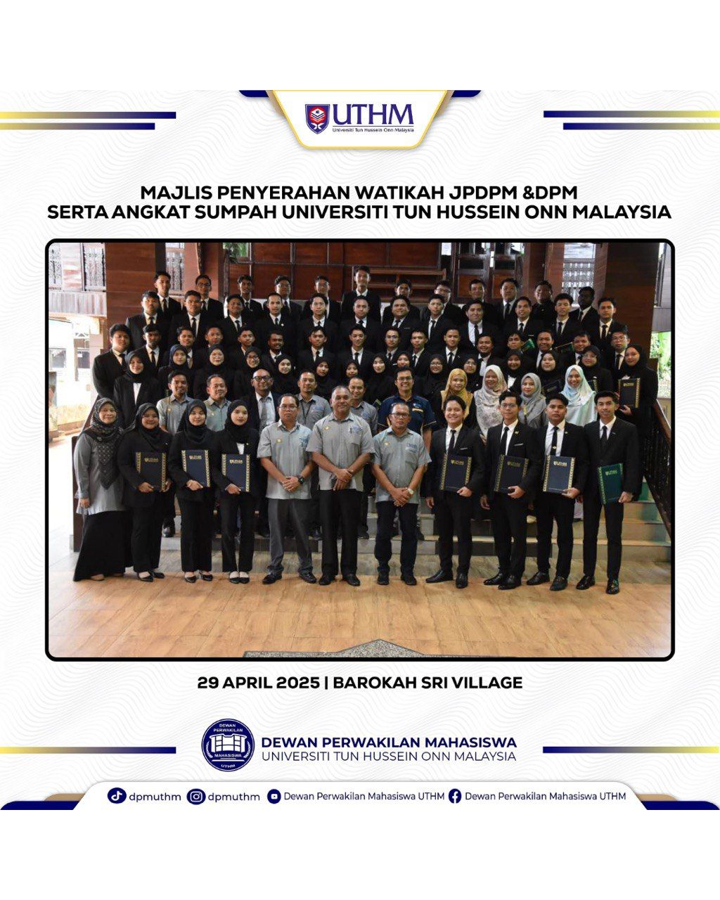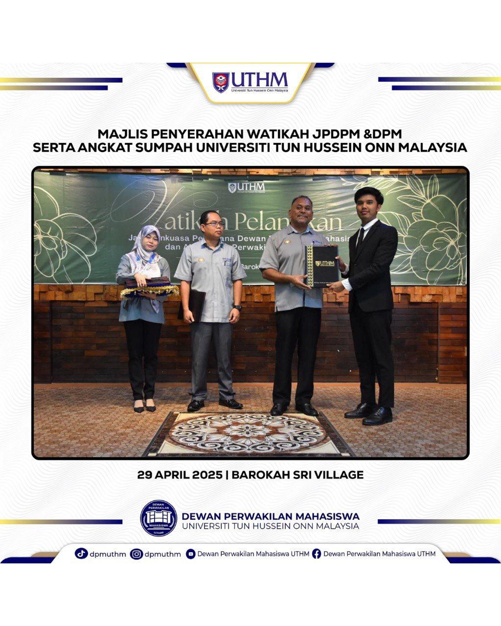 Alhamdulillah, telah sempurnanya majlis penyerahan watikah dan angkat sumpah kepada Jawatankuasa Pelaksana Dewan Perwakilan Mahasiswa dan Ahli Dewan Perwakilan Mahasiswa bagi edisi ke-6 pada 29 April 2025 di Barokah Sri Village yang dianjurkan oleh pihak Pejabat Hal Ehwal Pelajar UTHM.
