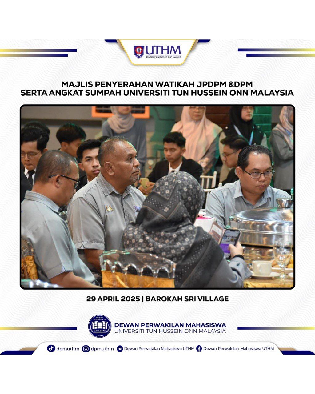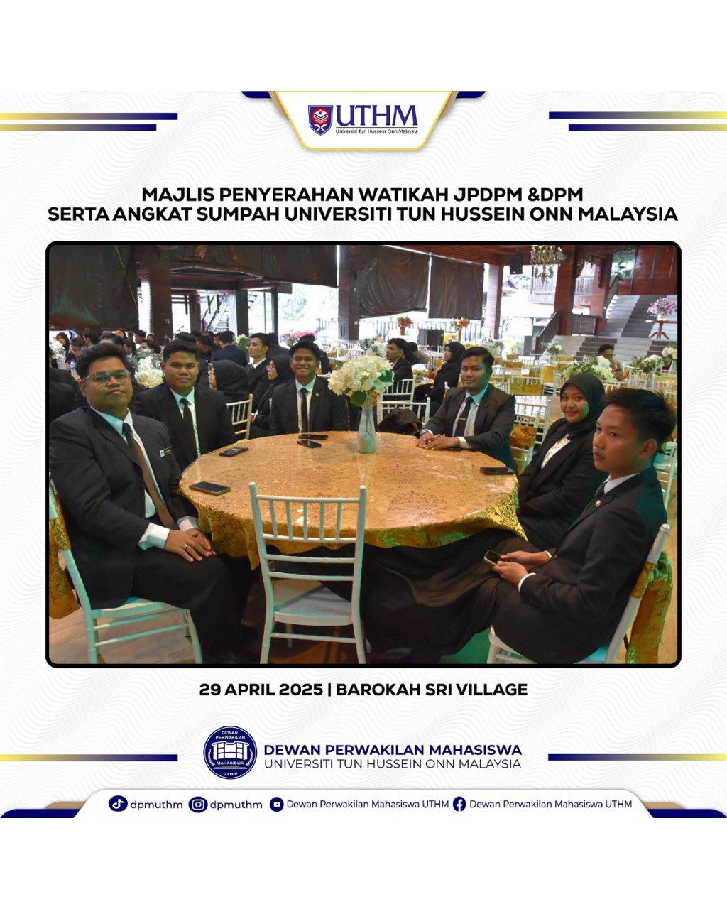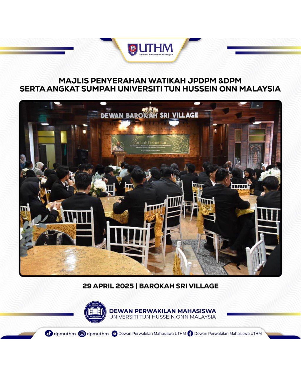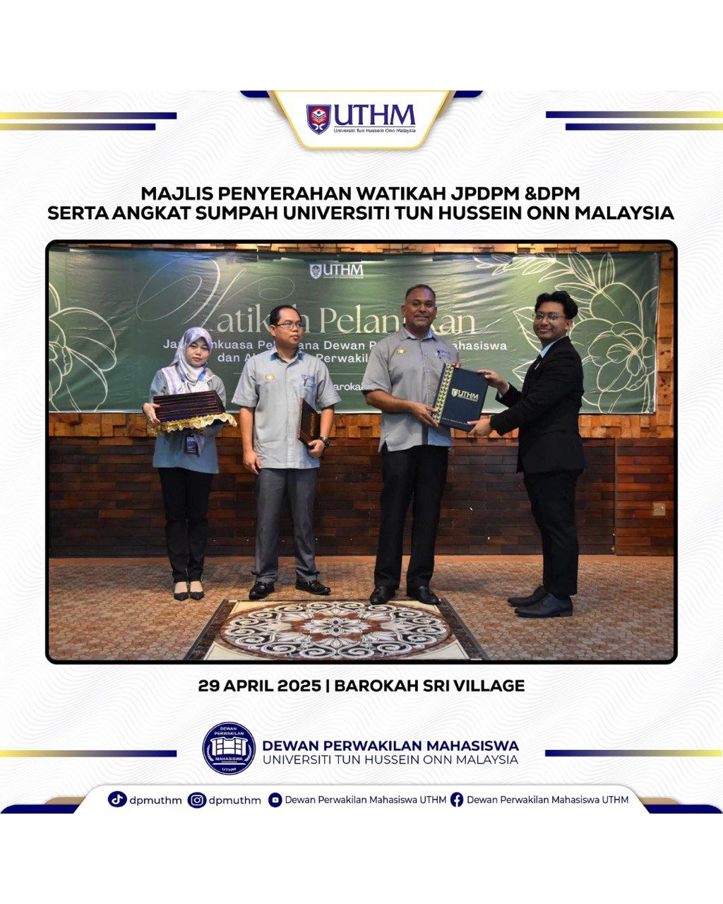 Alhamdulillah, telah sempurnanya majlis penyerahan watikah dan angkat sumpah kepada Jawatankuasa Pelaksana Dewan Perwakilan Mahasiswa dan Ahli Dewan Perwakilan Mahasiswa bagi edisi ke-6 pada 29 April 2025 di Barokah Sri Village yang dianjurkan oleh pihak Pejabat Hal Ehwal Pelajar UTHM.